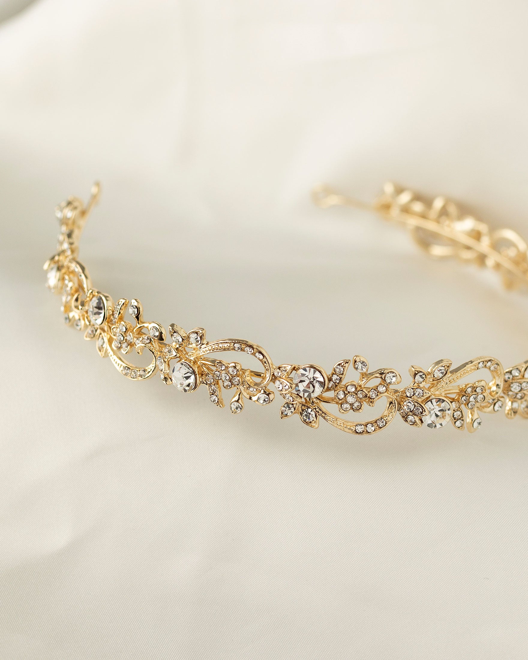 An exquisite scrolling flower design adorned with crystal stones and all set in gold plate. This bridal headband will add elegance to your wedding hairstyle! It could be worn as a headband or tiara.