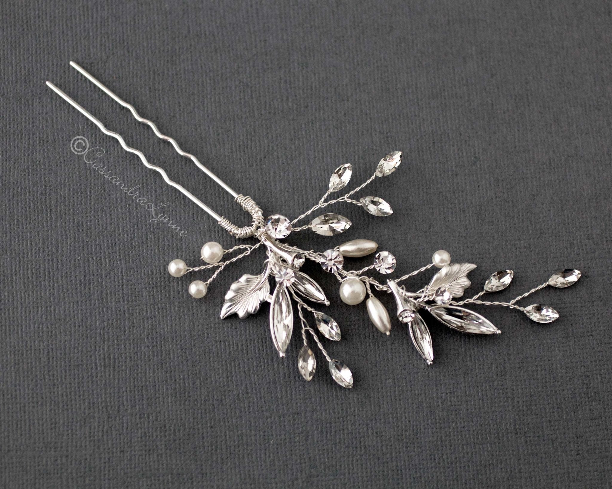 This gorgeous bridal hair pin features off-white oat and round-shaped pearls, frosted silver leaves, and several sizes of marquise crystal stones. The design is about 3.5 inches long and 2 inches wide.