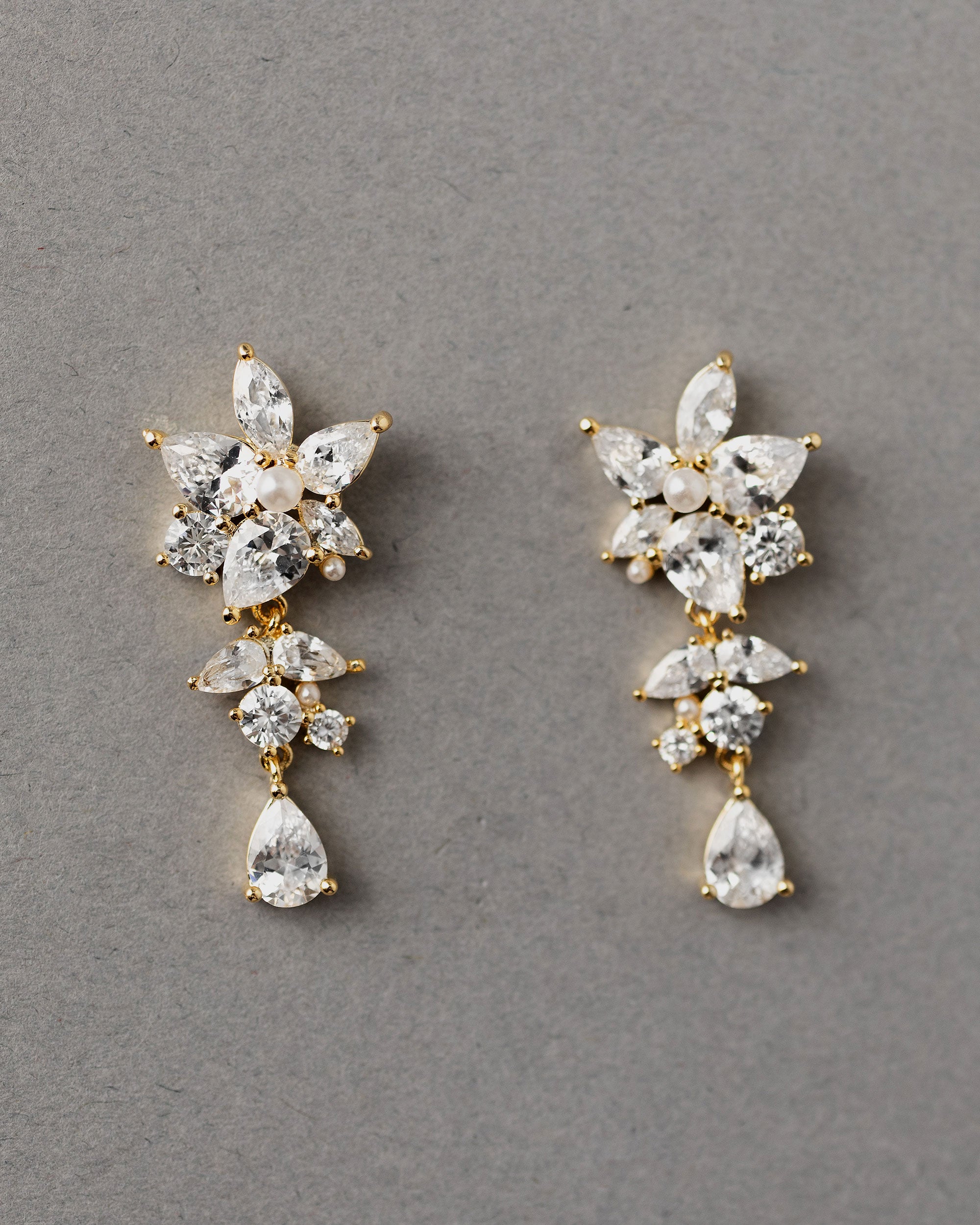 Sparkling CZ earrings with a flower motif! Pear and round cut jewels create a flower with a tiny pearl center and brilliant cluster drops.