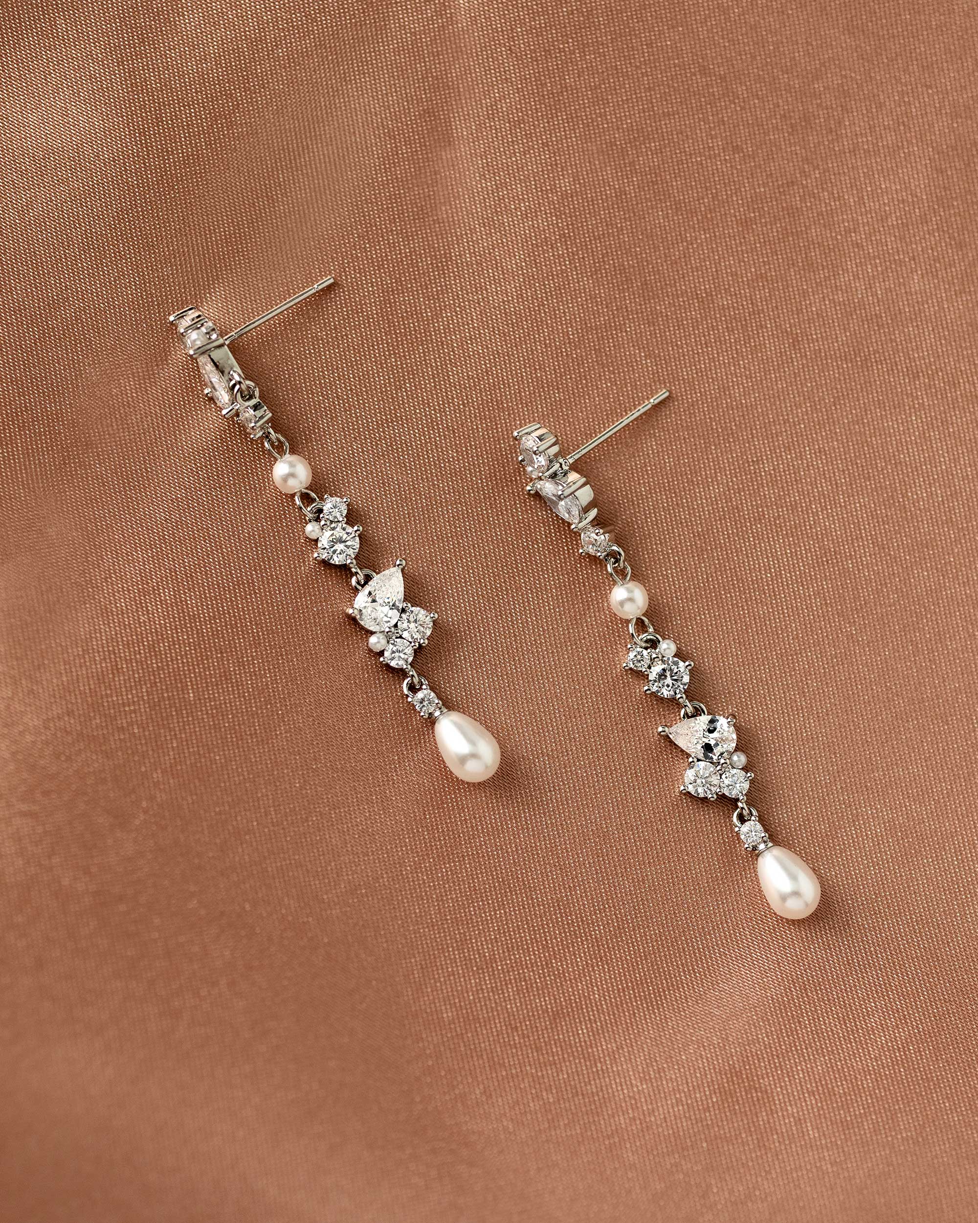 Bright pear and round cut CZ jewels share this design with off-white pearls to create a stunning look. Add to any special occasion outfit as the finishing detail.