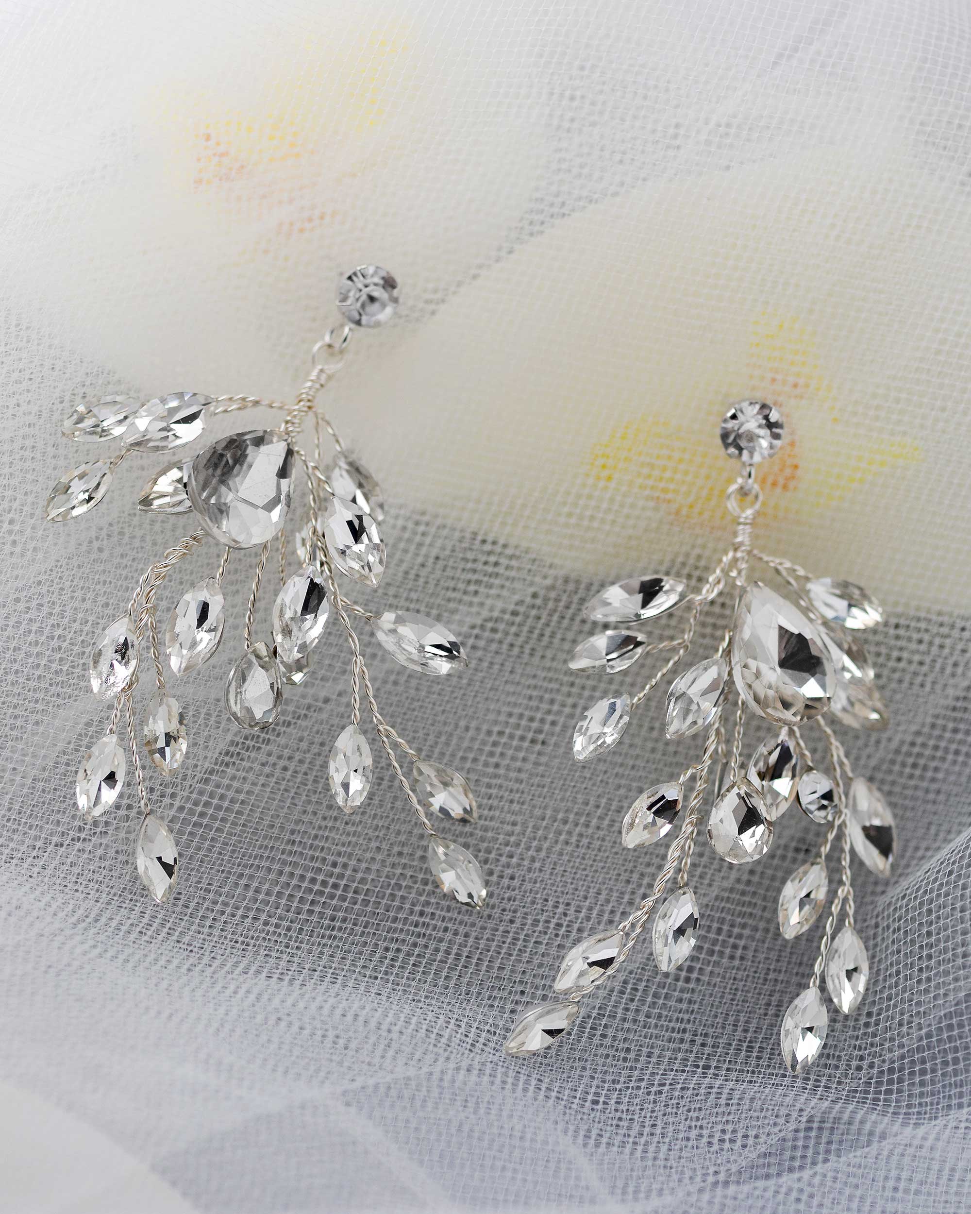 Shining rhinestones in various shapes are handwired into these silver statement earrings for the bride.