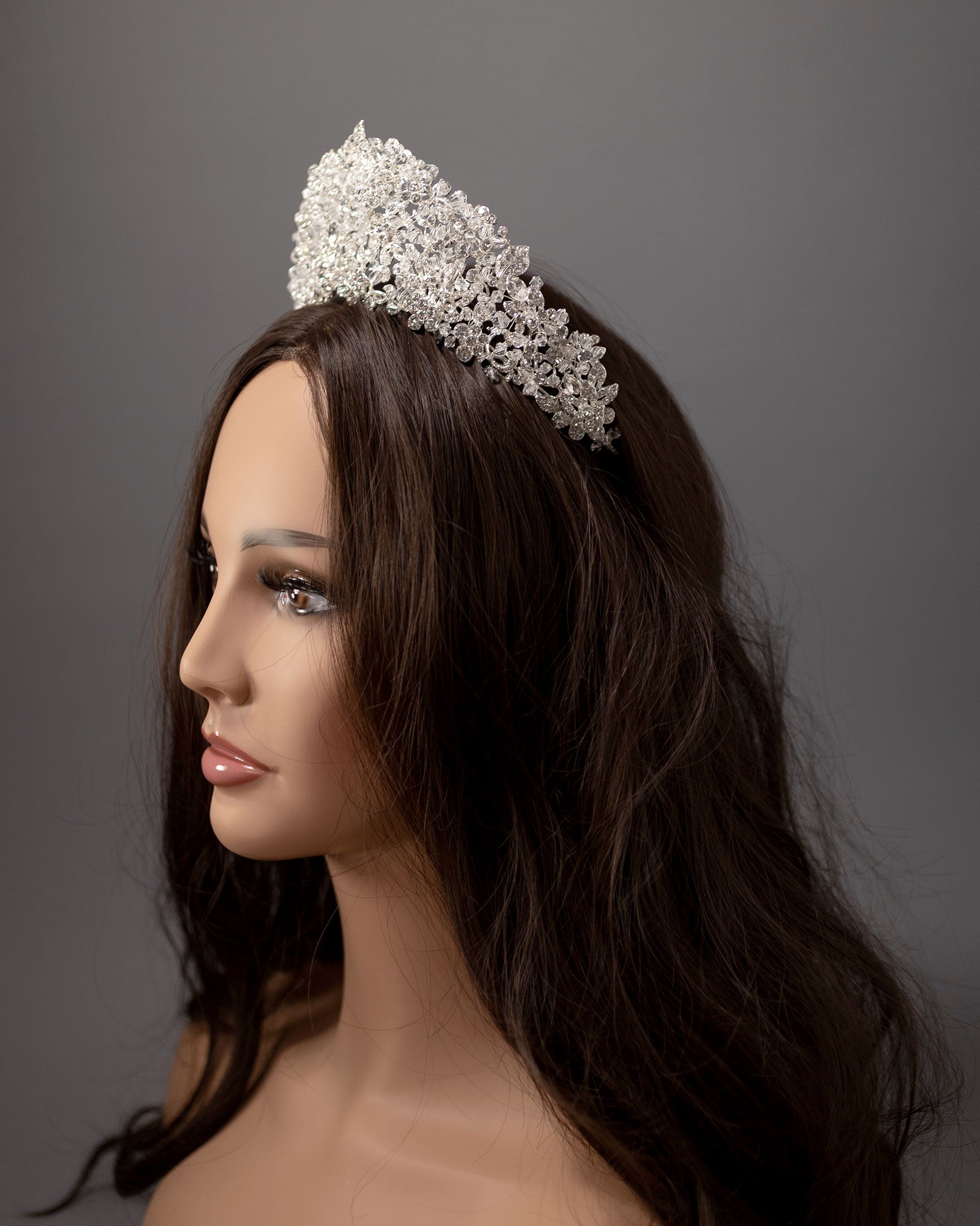 This gorgeous statement crown features rhinestone leaves, flowers, and scrolls covered in dozens of crystal beads. It is a wonderful headpiece for any bride or any occasion that calls for a statement. This tiara is 2.5 inches high, and the design is 11.5 inches along the band.